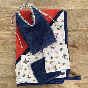 Kit de naissance (cape de bain / cotons lavables / bavoir) – Motif papillon