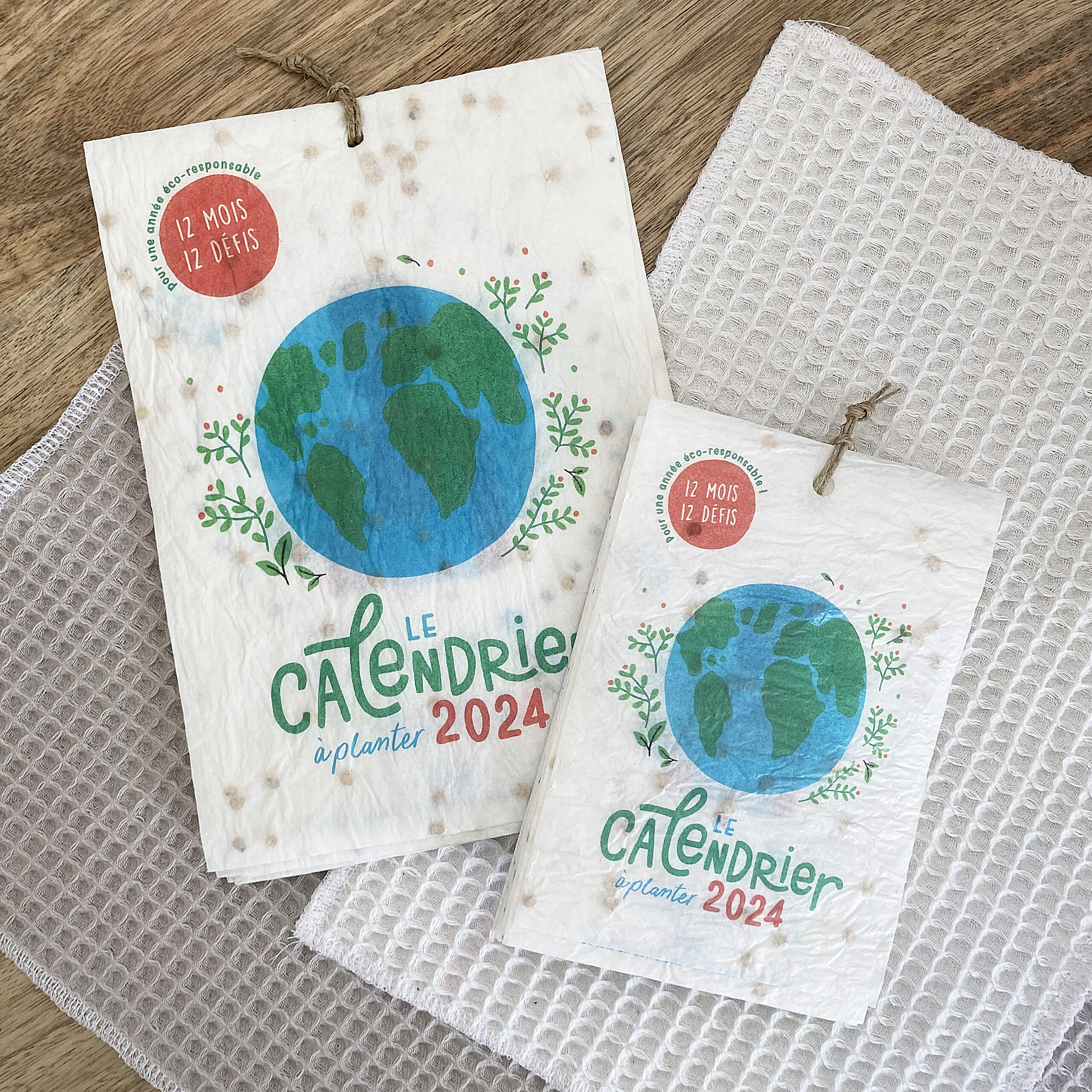 Calendrier à planter en papier naturel avec semences incorporées illustré mois par mois sur le thème de la planète.